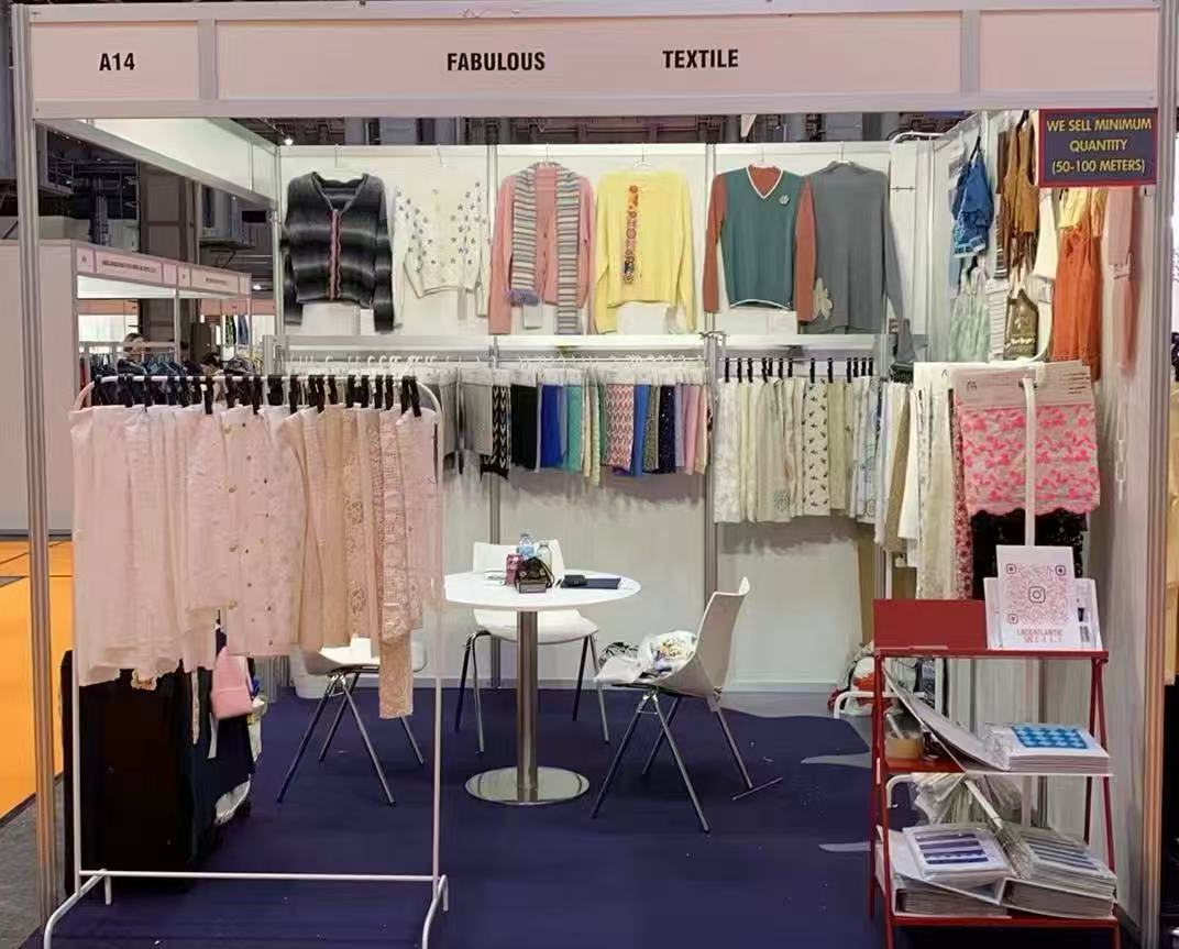 Several people of FABULOUS TEXTILE went to the ‘Barcelona Textile Expo’ exhibition which held in Fira De Barcelona during June 2nd to 4th, 2025.In order to participate in this exhibition, we have started preparations two months ago. we have been searched the popular and best-selling yarns over the market, then we have selected some of them and arranged knitting swatches;we also have customized the company’s format swatch card,hanger card and card booklets, and arranged personnel to make hanger swatches, color card books and booklets.During the exhibition, the flow of people was average, but we still received over twenty potential clients, including designers, purchasers, traders, etc. They were mainly from Spain, and some were from neighboring countries such as Sweden, the United Kingdom, and France.They selected many pieces of fabric and color cards at our booth and cut them to take away, looking forward to establishing a long-term cooperation in the future.This exhibition enabled FABULOUS to make a name for itself in the European market and also laid a foundation for our company’s expansion of business in Europe .We will spare no effort to provide customers with high-quality products and services, and hope to make progress together with our customers.
